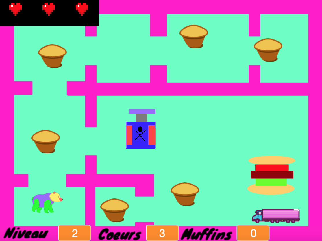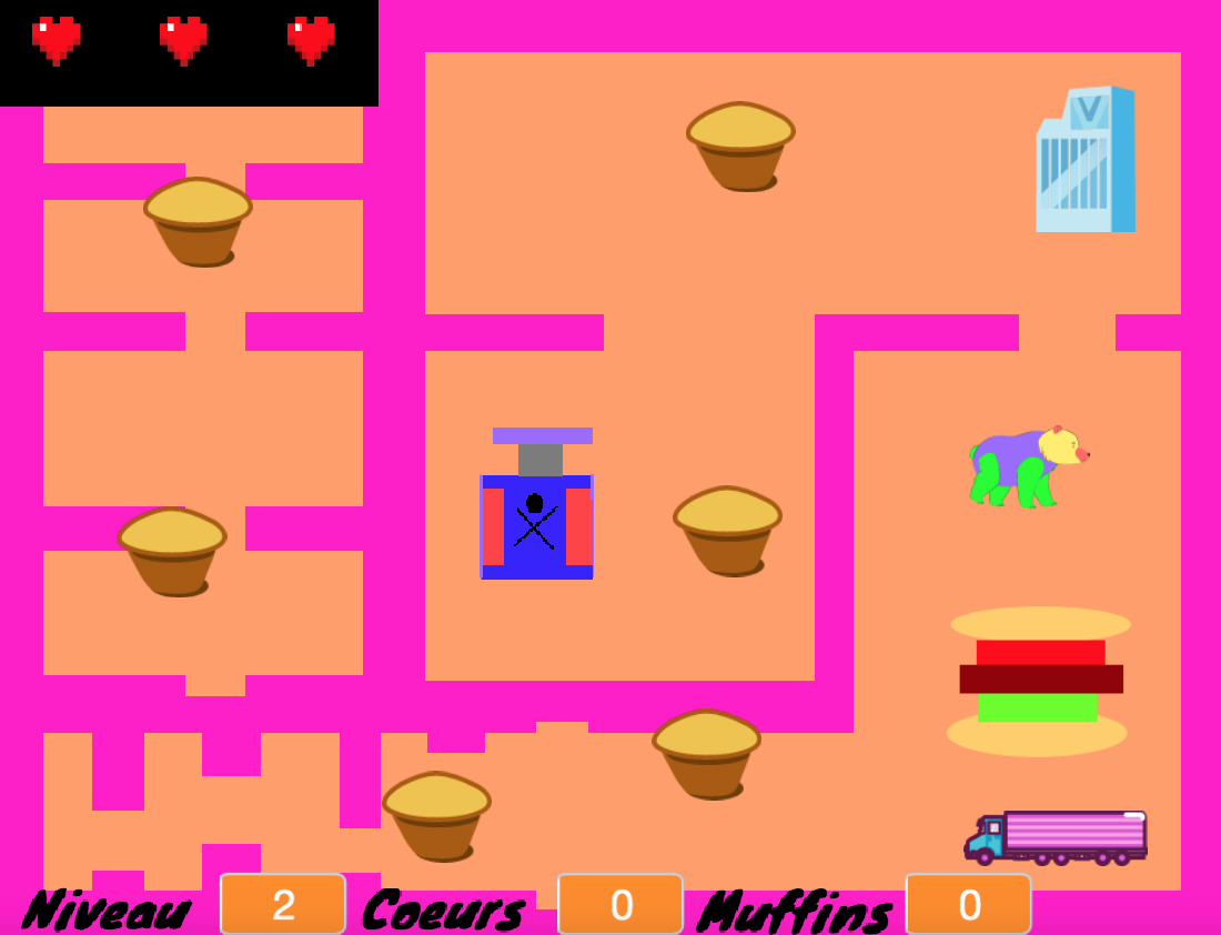 Voici mon jeu que j'ai crée sur Scratch, c'est un labyrinthe le but est d'aller au dernier niveau en mangeant tous les muffins. Vous pouvez tester le jeu ci-dessus !